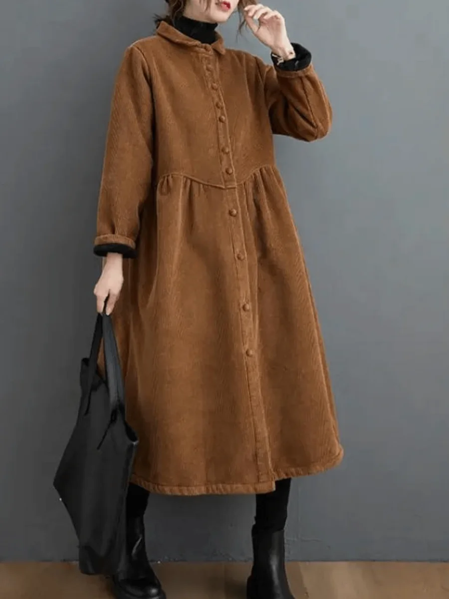 Abbraccia la stagione invernale con stile grazie al nostro trench da donna in velluto a coste, la perfetta combinazione di moda e funzionalità. Progettato per mantenerti caldo ed elegante, questo trench è il tuo compagno invernale essenziale. Il suo classico colletto risvoltato e la lusinghiera silhouette a trapezio aggiungono un tocco di fascino vintage al tuo guardaroba, rendendoti immediatamente accattivante.