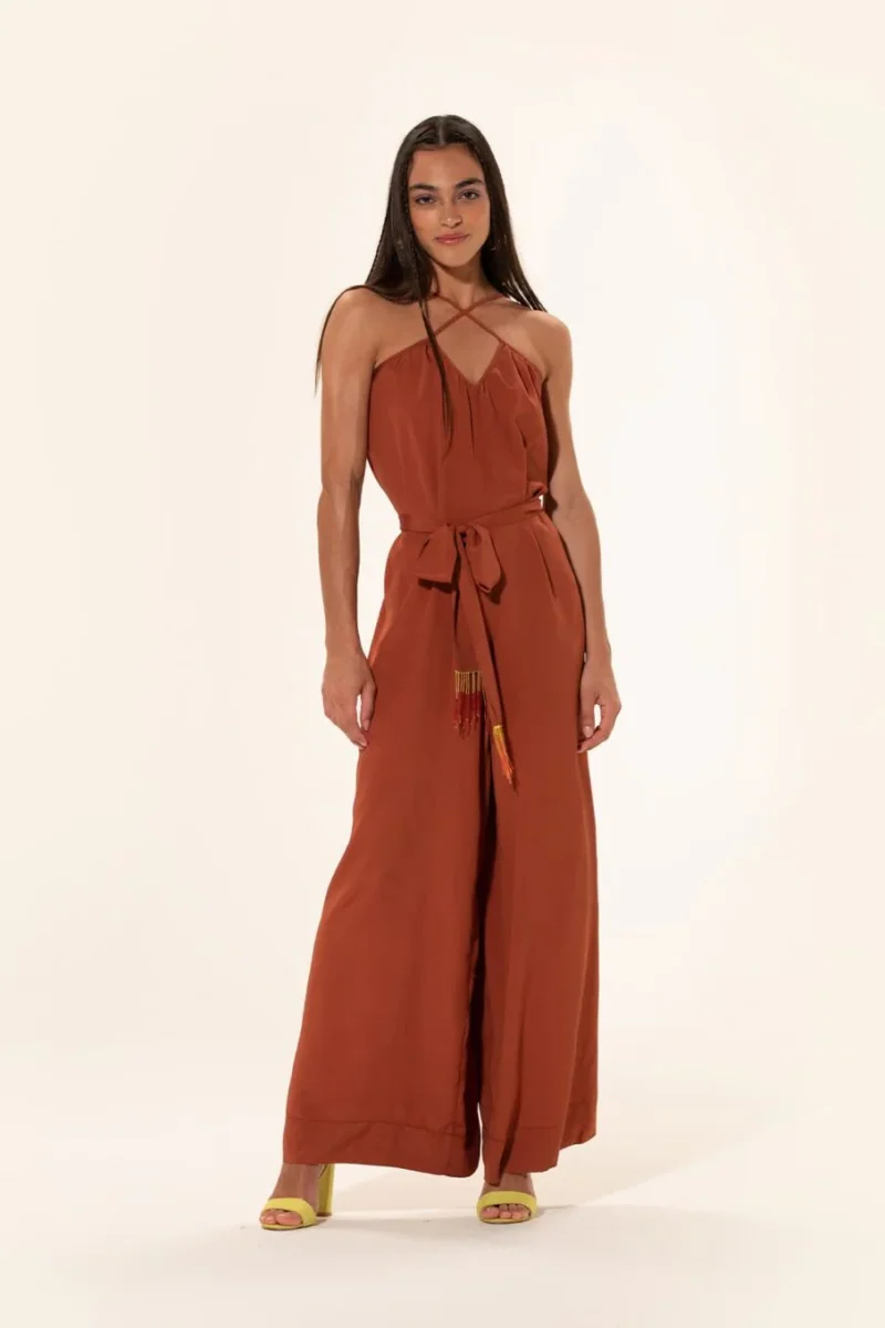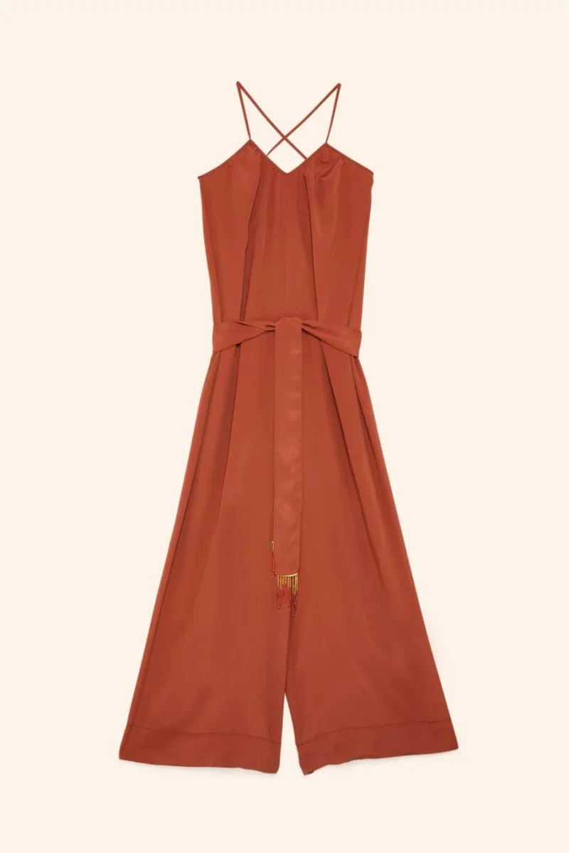 Tuta lunga e ampia in crepe de chine di viscosa seta, con spallini fini e incrocio sul dietro, fusciacca removibile con dettaglio perline.