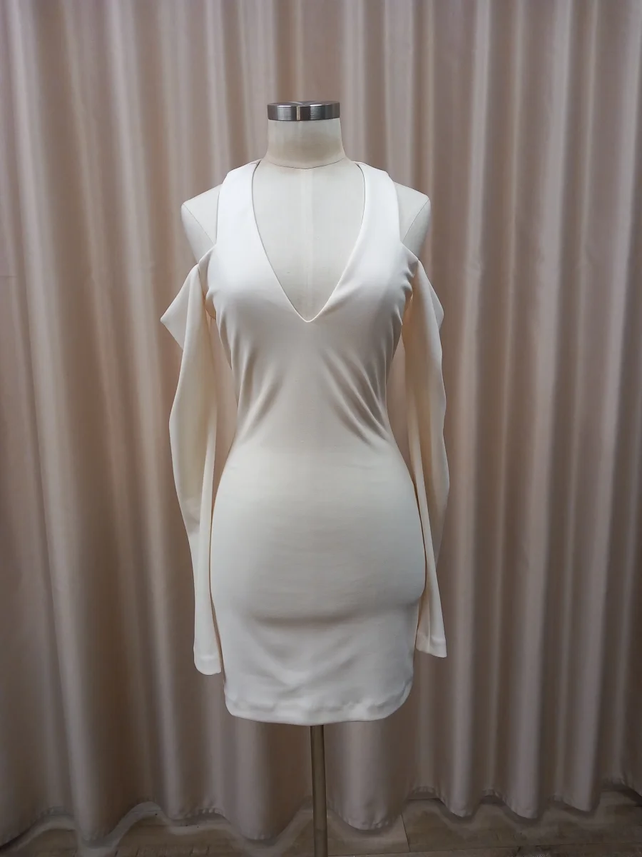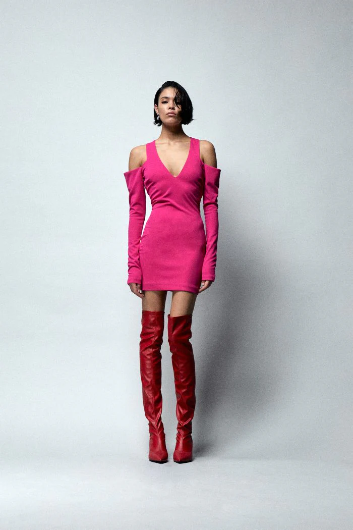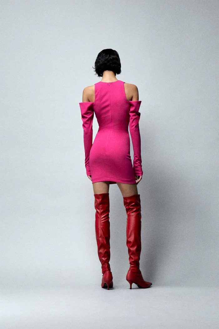 ABITO MINI ADERENTE IN SCREPPINO. MODELLO CON PROFONDO SCOLLO A V CHE ESALTA LA FEMMINILITÀ CON UN TOCCO DI SENSUALITÀ. LA SPALLA SCOPERTA, ABBINATA ALLE MANICHE LUNGHE, CREA UN CONTRASTO AFFASCINANTE E DONA AL LOOK UN’ANIMA ROCK.